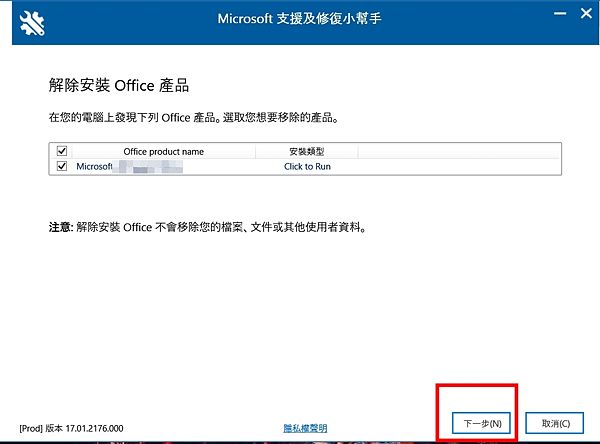5.在 [解除安裝 Office 產品] 視窗中,選取您要解除安裝的 Microsoft office版本,然後選取 [下一步]。