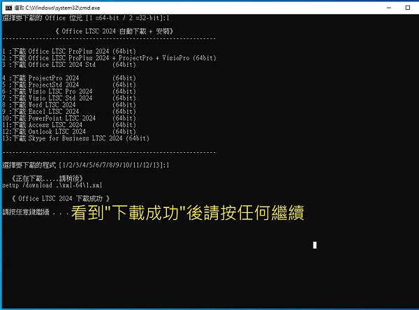 [編輯] 依需求選擇下載32位元或64位元,本範例為64位元故選”1”(鍵盤打"1"),後按"Enter"鍵(Select to download either the 32-bit or 64-bit version as needed. For this example, choose "1" for 64-bit, then press "Enter")