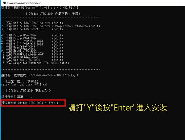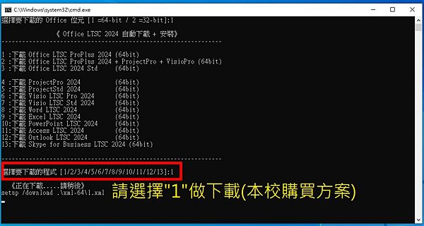 [編輯] 選擇要下載的程式請選"1"(鍵盤打"1",本校授權版本),後按"Enter"鍵 (To select the program to download, choose "1" (the version licensed by our school), then press "Enter")
