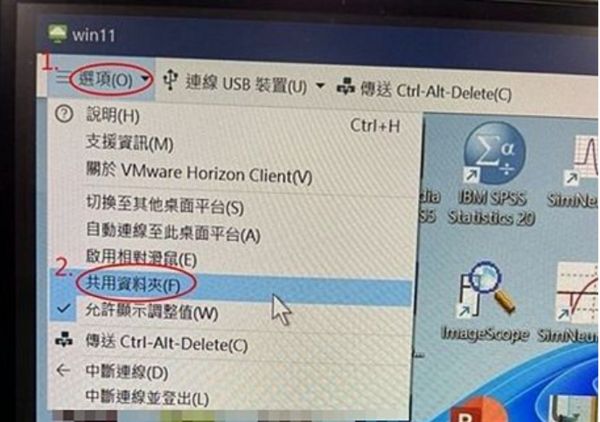 A.進入雲端電腦教室請點左上角叫出下拉選單,然後(1)選項-->(2)共用資料夾