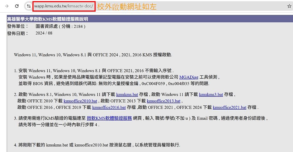 + | ==<font size="5px">校外(當你使用校外網路)請於瀏覽器網址列鍵入網址wapp.kmu.edu.tw/kmsactv-doc/開啟網頁後點擊網頁中說明第2點下載KMS啟動檔</font><font size="4px" color="#FF0000">[Off-campus (when using an off-campus network): Please enter the URL wapp.kmu.edu.tw/kmsactv-doc/ in your browser's address bar. Click on the second step in the instructions to download the KMS startup file.]</font>== | ||