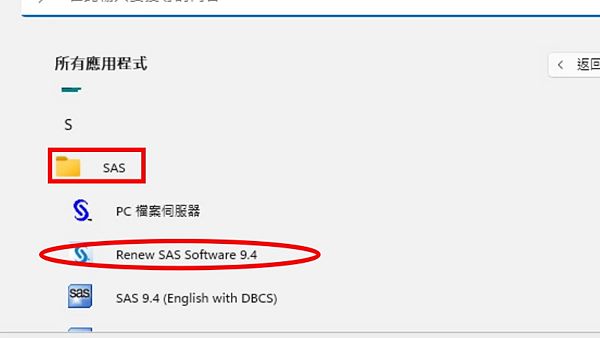 | - | = | + | = <font size="4px">尋找"S"開頭內的"SAS"資料夾(如下圖紅方框處),點擊展開後,執行"Renew SAS Software 94"(如下圖紅圓框處)</font><font size="4px" color="#F7A004">[Locate the "SAS" folder under "S" (as shown in the red square box below), click to expand it, then execute "Renew SAS Software 94" (as shown in the red circle below)]</font> = |
