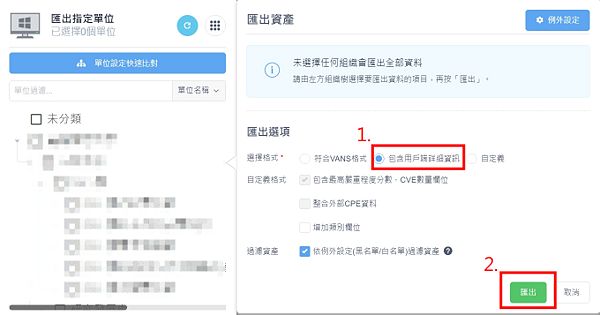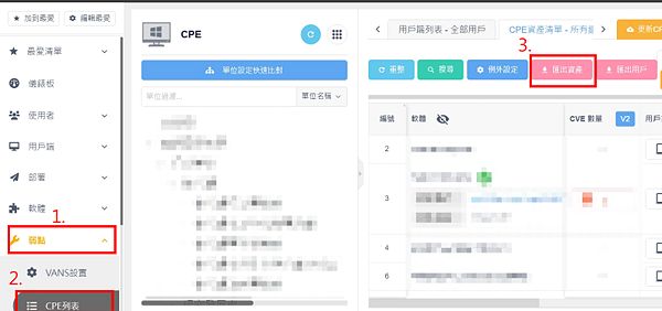 -= 進入後台管理程式後點擊1.”弱點”-->2."CPE列表"-->3."匯出資產" =+=<font size="4px"> 進入後台管理程式後點擊1.”弱點”-->2."CPE列表"-->3."匯出資產"</font> =