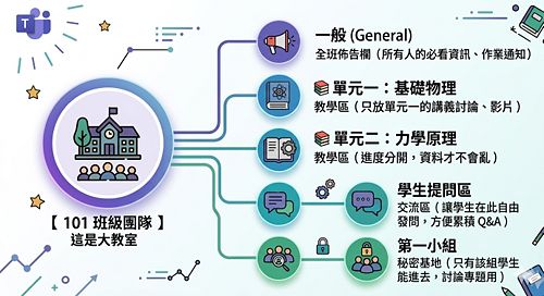 如果說「團隊」是一間大教室,那麼「頻道」就是教室裡的佈告欄、分組作業桌或特定學科的討論區 頻道是將團隊內的大量資訊進行「分類管理」的工具。