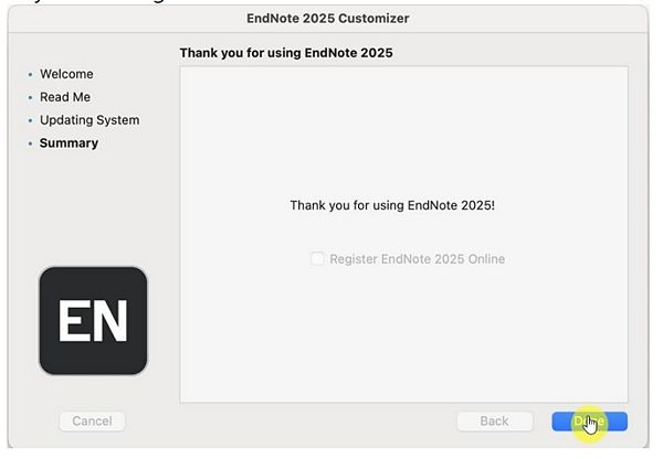 [編輯] 顯示”Thank you for using EndNote2025”,請點擊Done,完成安裝。