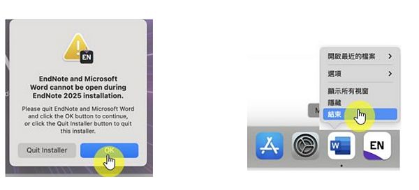 [編輯] 若顯 示”EndNote and Microsoft Word cannot be open during EndNote2025 installation”視窗,請點擊「OK」回到工具列將WORD完全結束