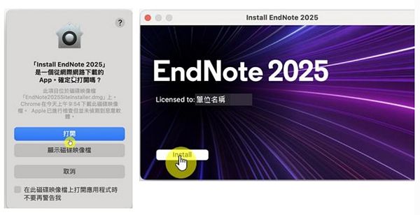 [編輯] 顯示「Install EndNote2025」 是一個從Internet下載的App。確定要打開嗎? 請點擊"打開"顯示授權單位名稱請點擊"Install"開始進行安裝