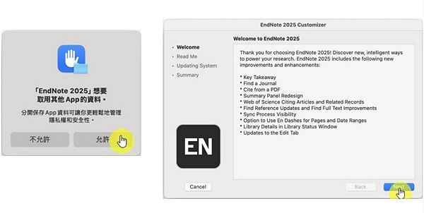 [編輯] 顯示”EndNote2025想要取用其他APP的資料”視窗,請點擊「允許」顯 示”Welcome to EndNote 2025”請點擊 "Next"