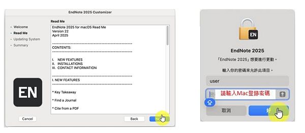 [編輯] 顯示”Read Me”,請點擊Next,若顯示EndNote2025想要進行更動,請輸入Mac登錄密碼後點擊”好”