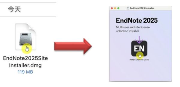 [編輯] 從單位網頁下載載檔名為 EndNote2025 SiteInstaller.dmg 檔案於個人MAC 電腦中。點 選EndNote2025SiteInstaller.dmg 執行,顯示EndNote2025 Installer視窗,請點擊二下開始進行安裝。※安裝之前請關閉Word和PowerPoint及Outlook ...等OFFICE程式※