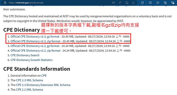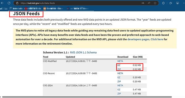 [編輯] 在JSON Feeds分類補充說明,CVE-Modified為CVE最近修改的部分,CVE-Recent為最近的,CVE-2024是依年份發佈,依需更新選Gz或ZIP擇一下載